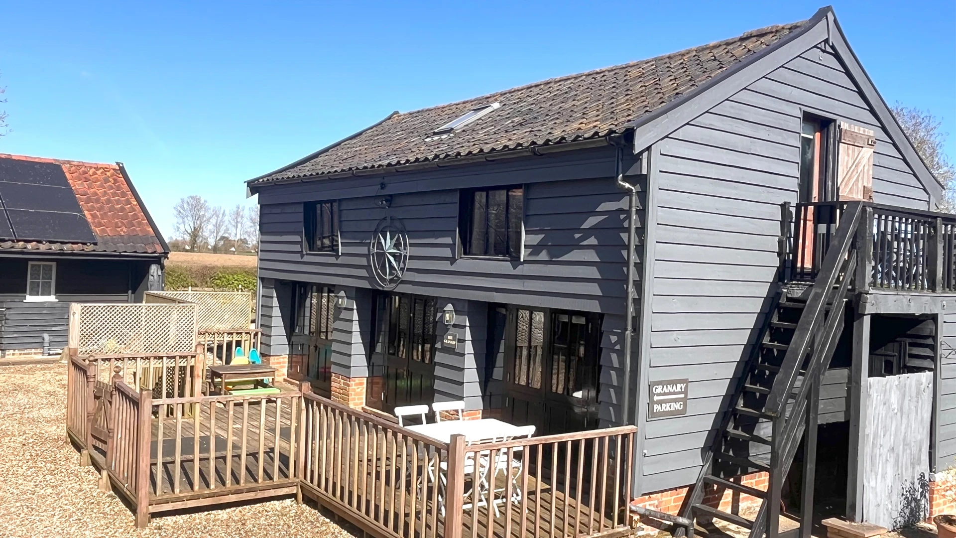Comes with Vaulted barn space and wood burner, two sittings and a private garden. While upstairs has 3 beds accessed via two stair cases. 2 beds have 2 singles and the other a kingsize. Lastly, a further king size be ensuite overlooking the garden with decking. Extra bed available as optional extra fee during booking confirmation.